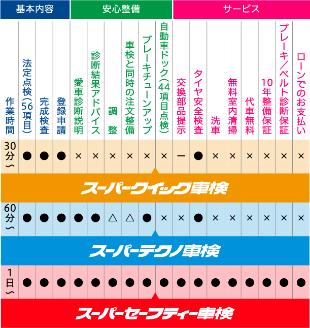 ※点検と検査のみを実施する為、整備や調整は行いません。車検に通らない箇所やお客様がご希望される整備は別途費用が必要となります。このメニューでは車検に通らない箇所やお客様からのご依頼整備があった場合スーパーテクノ車検・スーパーセーフティー車検に変更することが可能です。また、お車の状態により30分以上かかる場合があります。